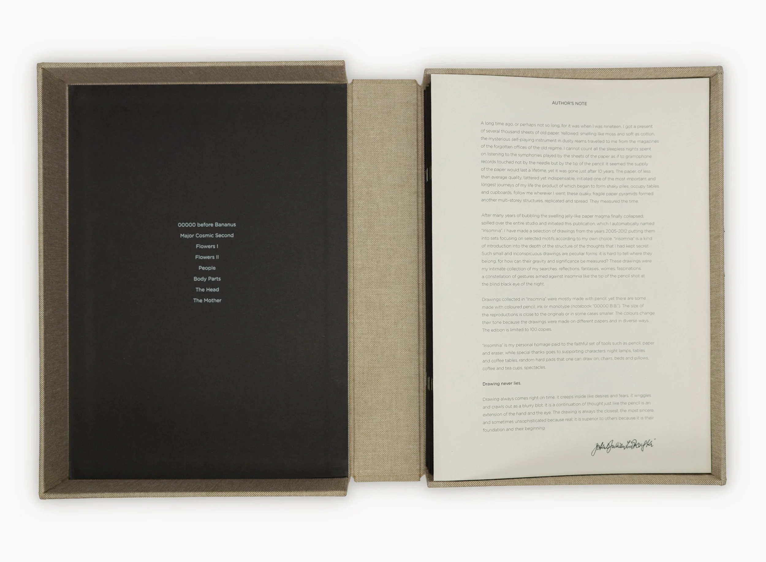 Insomnia is a cloth-bound edition presented in a hard box, consisting of eight booklets with a total of 222 reproductions of drawings.